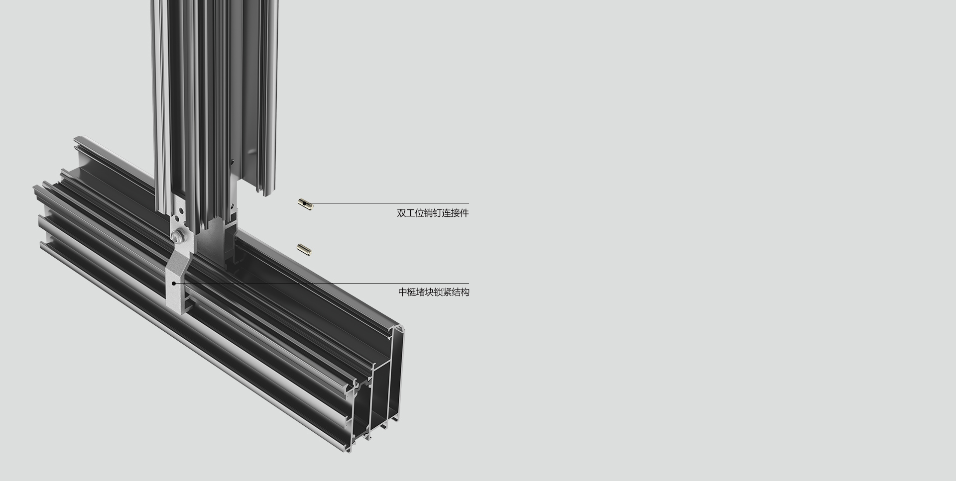 區別于傳統的螺釘連接,使用全鋁式中梃連接角碼,使用銷釘進行連接。能夠確保中梃的連接強度。同時在中梃連接角碼處注雙組份組角膠,增加中梃連接窗強度和密封性能。同時,在中梃連接處增加使用防水封片,進一步提升中梃處的防水。